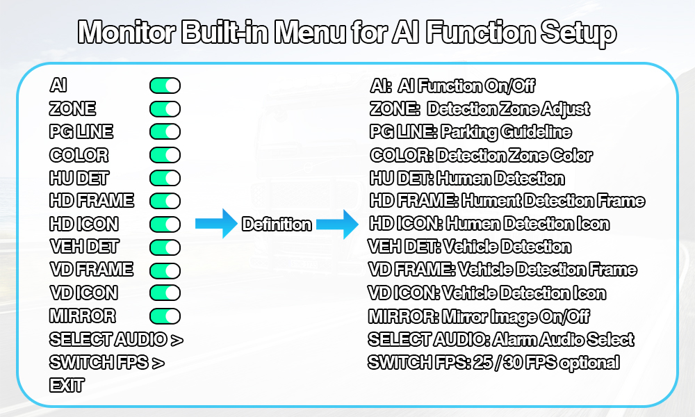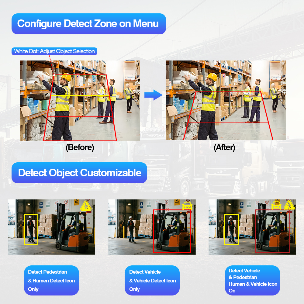 AI 死角検出カメラ システム内蔵色変更警告灯は、AI キャリブレーション設定をサポートする AI BSD カメラと AI モニターを含むインテリジェントな車両安全セットで、ユーザーは検出エリアのサイズ調整、選択可能な音声アラームの種類、歩行者検出のオン/オフ、車両検出のオン/オフ、その他のキャリブレーション設定などの AI 設定を変更できます。