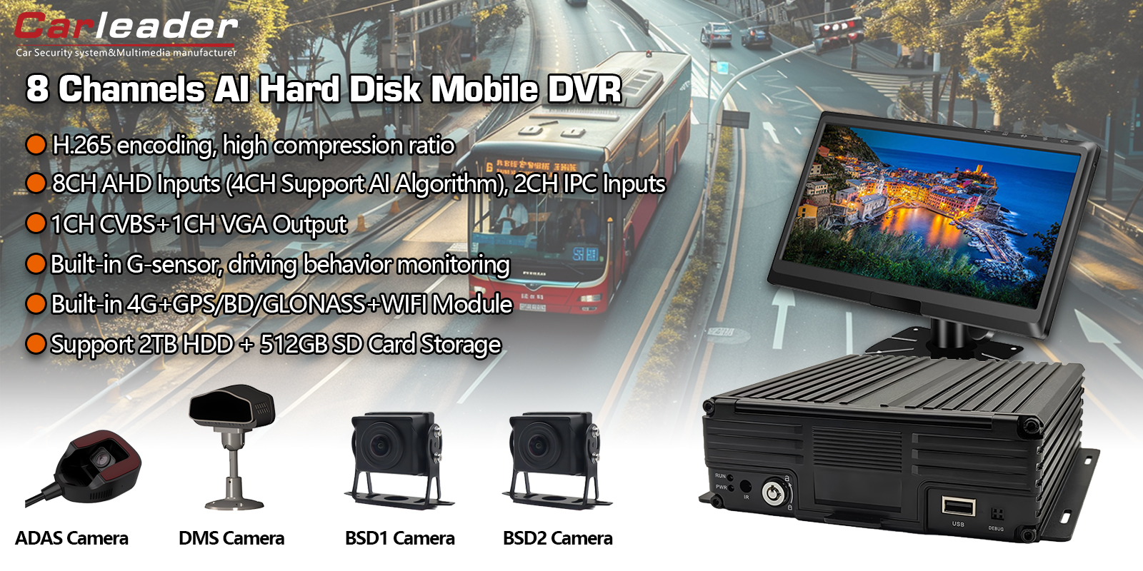 カーリーダー8CH AI HDD モバイル DVR サポート ADAS+DMS+BSDは、以下を必要とする商用車両、公共交通機関、物流、特殊車両に最適なソリューションです。