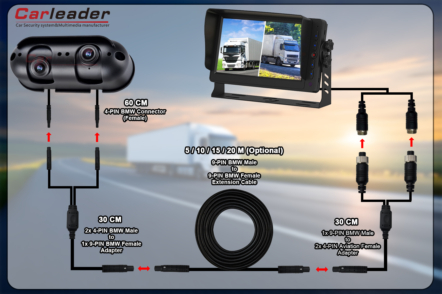 最初のソリューションでは、延長ケーブル (9 ピン BMW コネクタ) を 1 本のみ使用し、両端に 1 対 2 の分割ケーブルを使用してカメラとモニターを接続します。このソリューションは延長ケーブルのみを使用するため、配線プロセスがより簡単かつ便利になります。