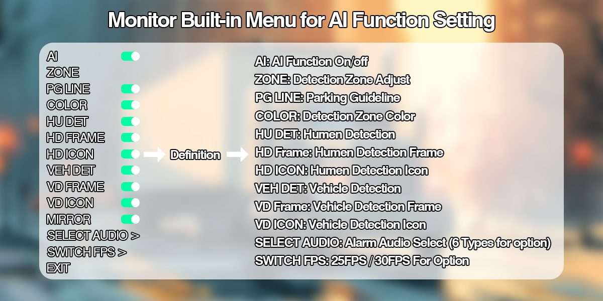 カーリーダー7 インチ AI BSD 死角検出監視システムサポート AI キャリブレーション、歩行者検出、車両検出をサポートし、運転中の安全性を大幅に向上させる AI カメラ ソリューションです。AI キャリブレーション メニューが組み込まれたモニターで、ユーザーは検出エリア、検出ゾーンのカラー表示のオン/オフ、アラーム音声の種類、車両と歩行者のアイコン表示、検出オブジェクトの選択などを調整できます。