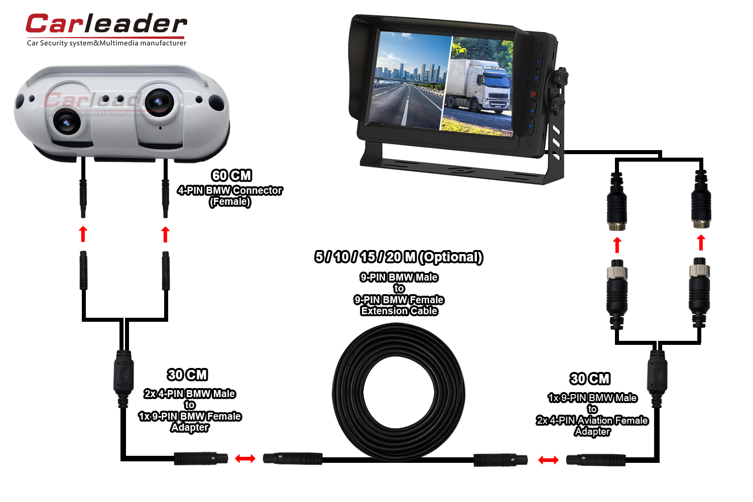 最初のソリューションでは、延長ケーブル (9 ピン BMW コネクタ) を 1 本のみ使用し、両端に 1 対 2 の分割ケーブルを使用してカメラとモニターを接続します。このソリューションは延長ケーブルのみを使用するため、配線プロセスがより簡単かつ便利になります。