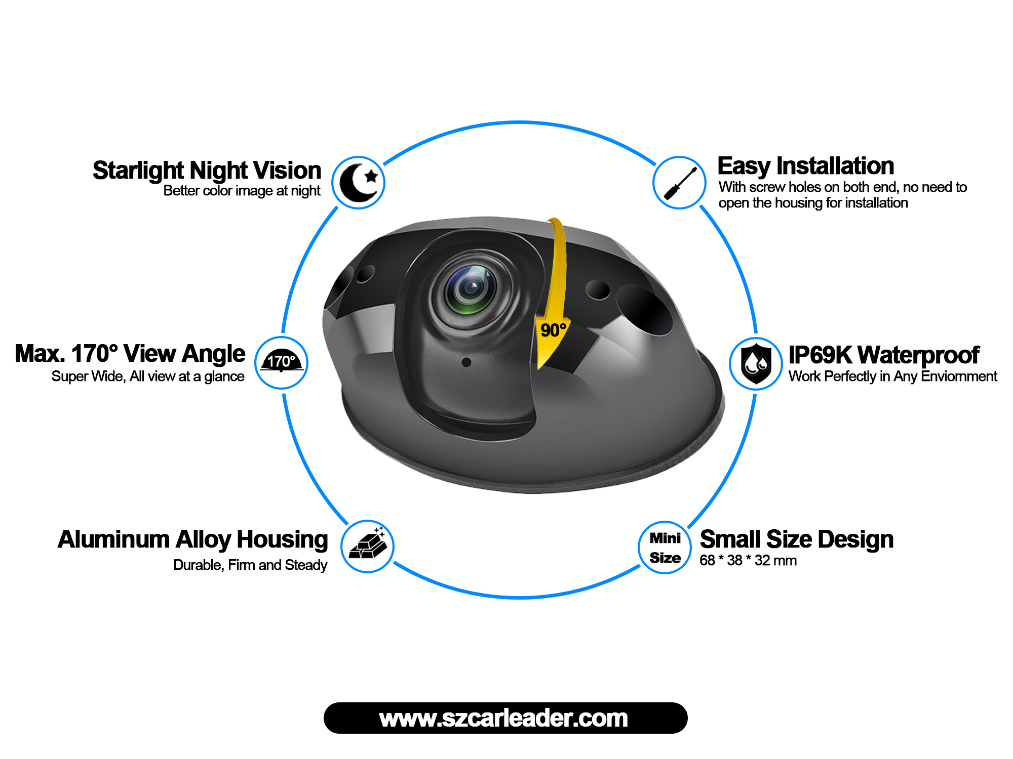AHD 170 度広視野角防水ヘビーデューティバックアップカメラは、運転中に鮮明なリアルタイム画像をドライバーに提供します。最大170°の超大型角度により、ドライバーは広範囲の監視範囲を提供できるため、ドライバーは死角なく車両の周囲の環境を監視できます。