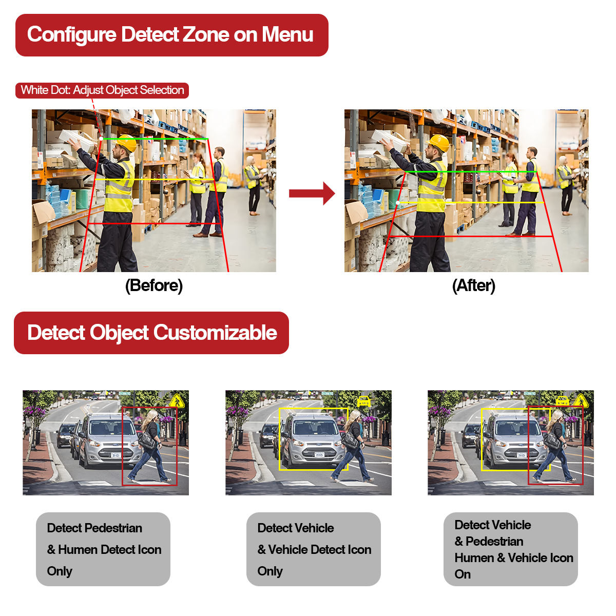 このAIカメラには警告灯機能が組み込まれており、検出物体が異なる検出エリア(赤、黄、緑)に入ると、ライトの色が対応する色に変わります。また、車両に近づく周囲の歩行者や車両に警報を発する警報機能も統合しています。