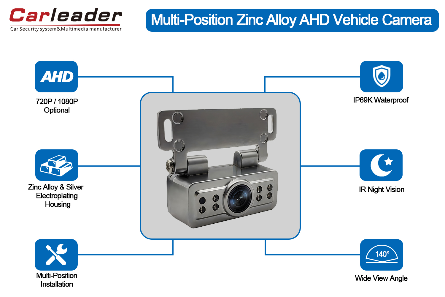 カーリーダーAHD シルバー電気メッキ車両後退カメラ、亜鉛合金ハウジングと銀電気メッキ、140度の広い視野角、IP69Kの防水性と防塵性を備えています。取り付け角度や位置はネジで固定することも可能です。