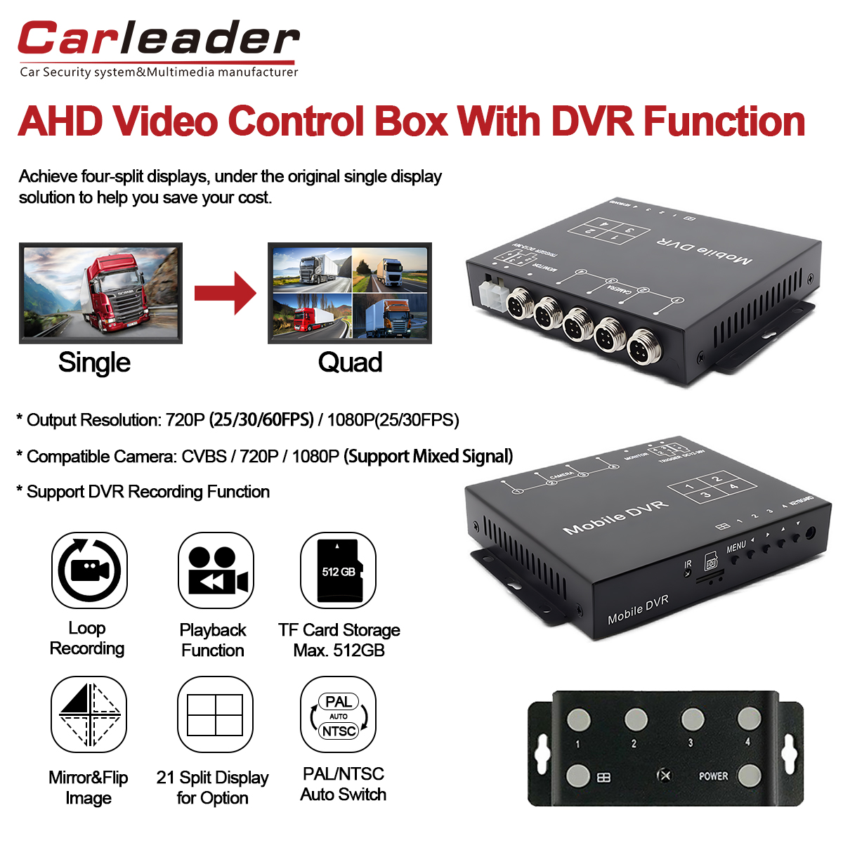 Carleader Quad Video Splitter Box は、4CH ビデオ スプリッター ボックスの利便性と DVR 録画機能の安全性を兼ね備えています。個別の画像設定、柔軟なトリガー モード (トリガー ワイヤーおよびリモート コントロール)、画面エッジ調整、幅広い電圧入力、堅牢な保護を含む包括的な機能セットは、要求の厳しいモバイル環境に合わせてカスタマイズされた信頼性の高い高品質の監視ソリューションを提供します。 Carleader 1080P AHD Quad Split Display ビデオ プロセッサーによるビデオ録画のサポートにより、完全な状況認識と安全なビデオ証拠を確保します。.