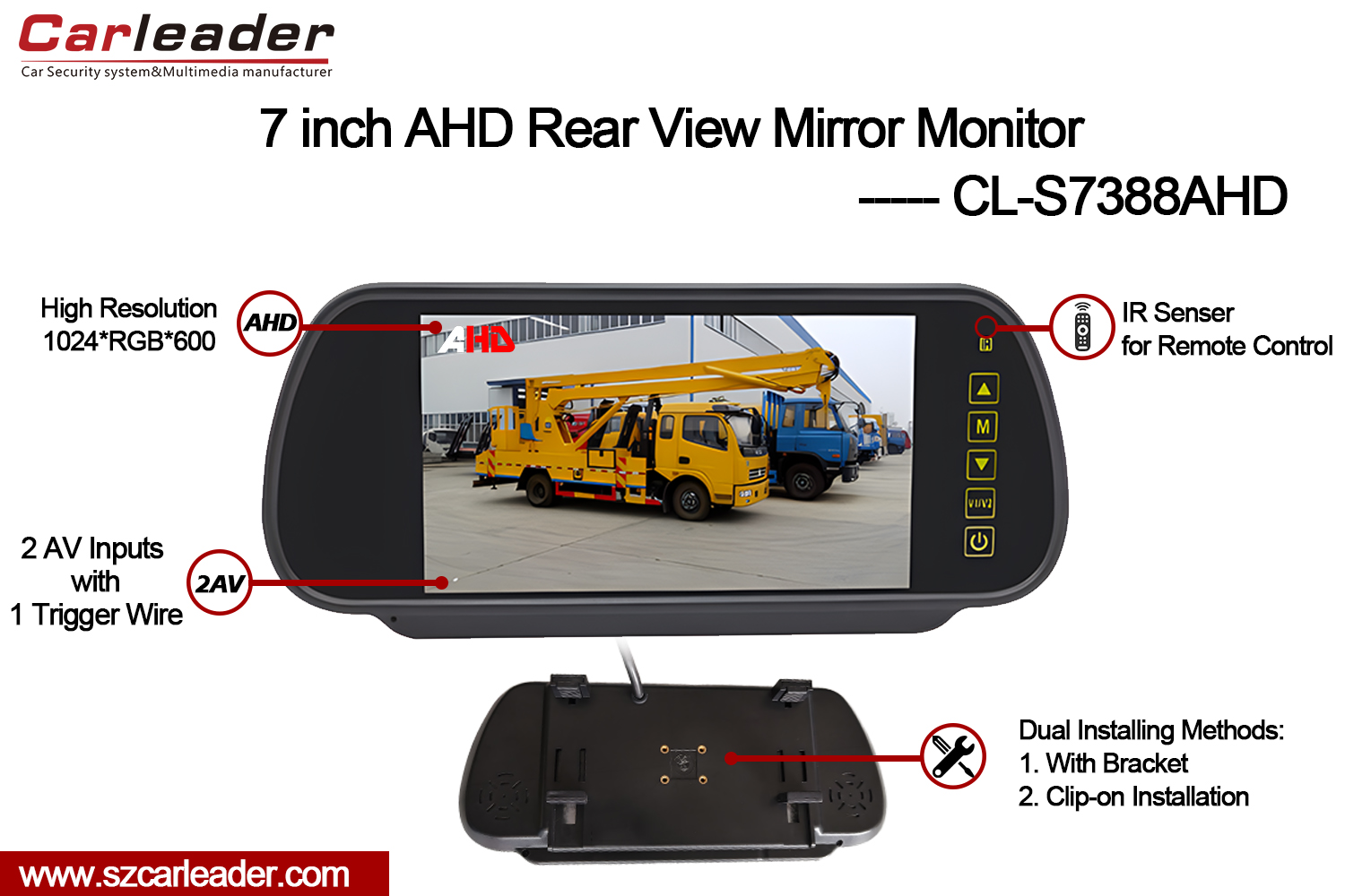 カーリーダー7インチTFT LCDバックミラーAHDモニターは、最新の車両モニタリング システムに優れた鮮明さと多用途性を提供するように設計された、高性能 7 インチ カーミラー AHD モニターです。高度な機能とユーザーフレンドリーなデザインを組み合わせたこのモニターは、さまざまな運転条件において信頼性の高いパフォーマンスを保証します。